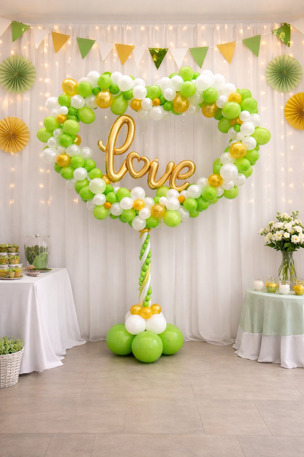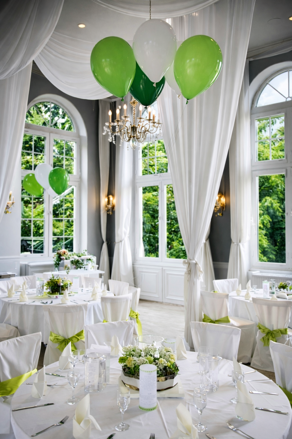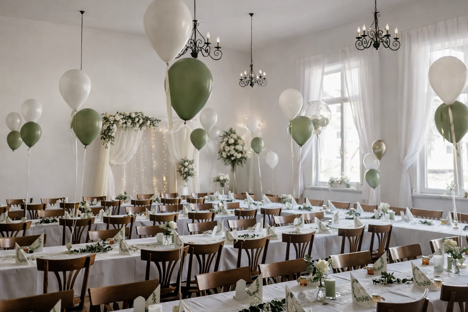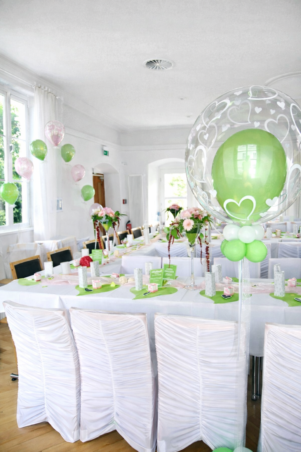 Ballondekoration Grün und Weiß für den Tisch und die Decke
