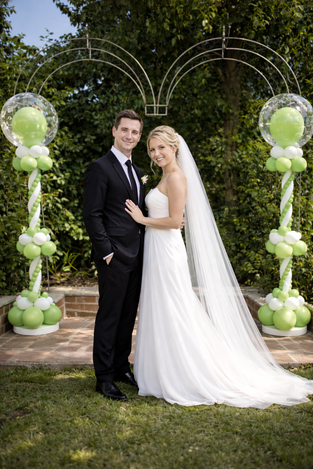 Ballonsäulen in Grün und Weiß mit großen Ballon