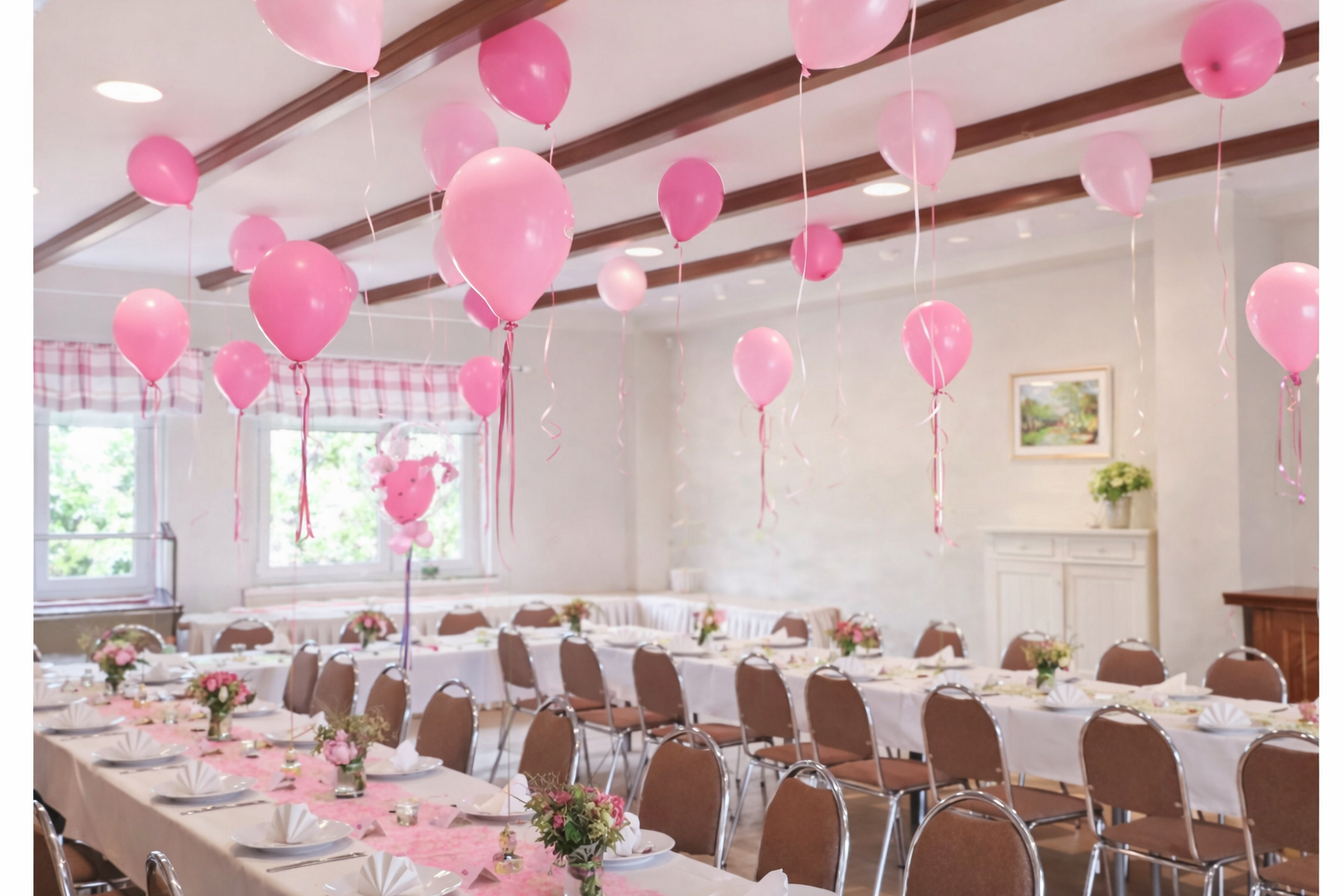 Die Ballons werden an der Decke, und auf dem Tisch platziert. So entsteht ein schönes Gesamtbild.