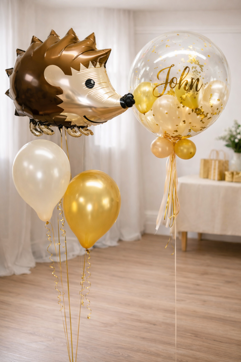 Dekoration mit Konfettiballon und Igel