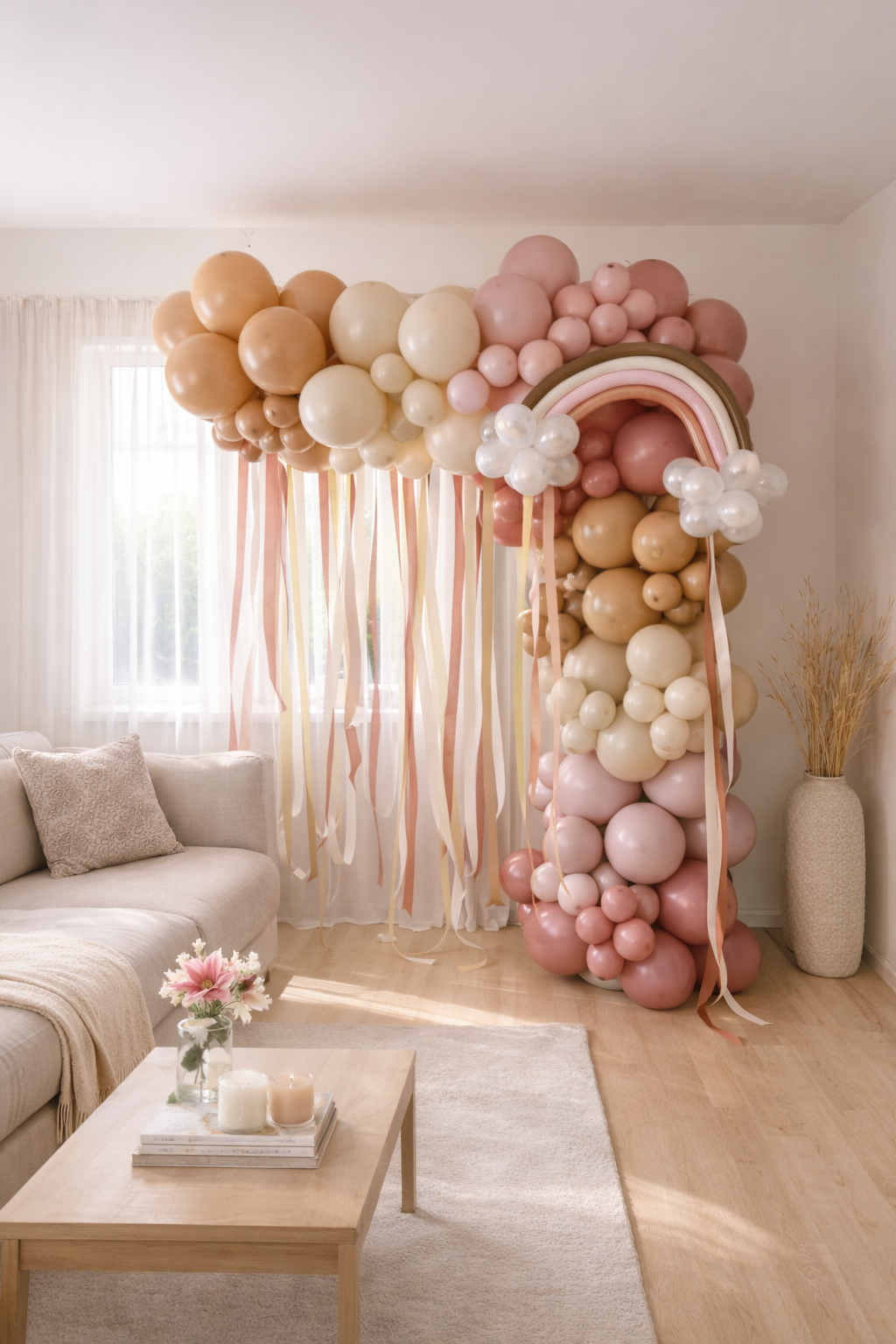 Es besteht aus einer Blumenwand mit passender Ballondekoration.