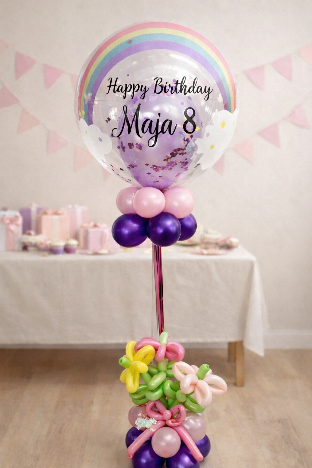 Konfettiballon mit Lila Ballon und Blumenstrauß