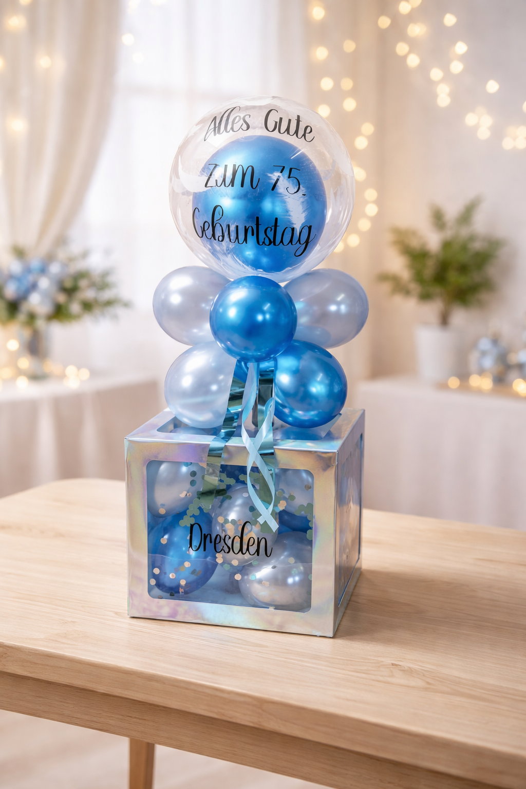 Box in Blau mit durchsichtigen Ballon