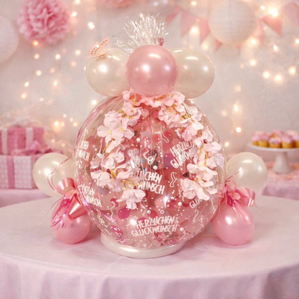 Geschenkballon Rosa und Weiß mit Blumen