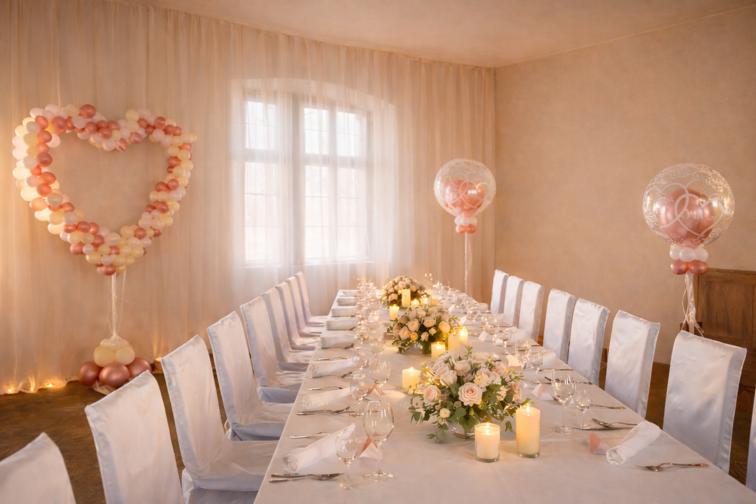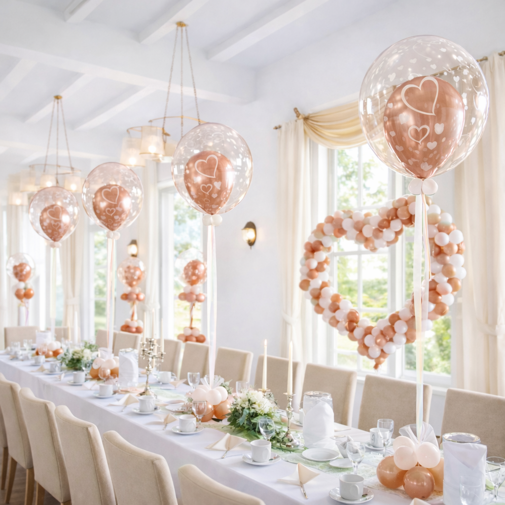 Dekoration in Rosengold und Weiß mit Konfettiballons