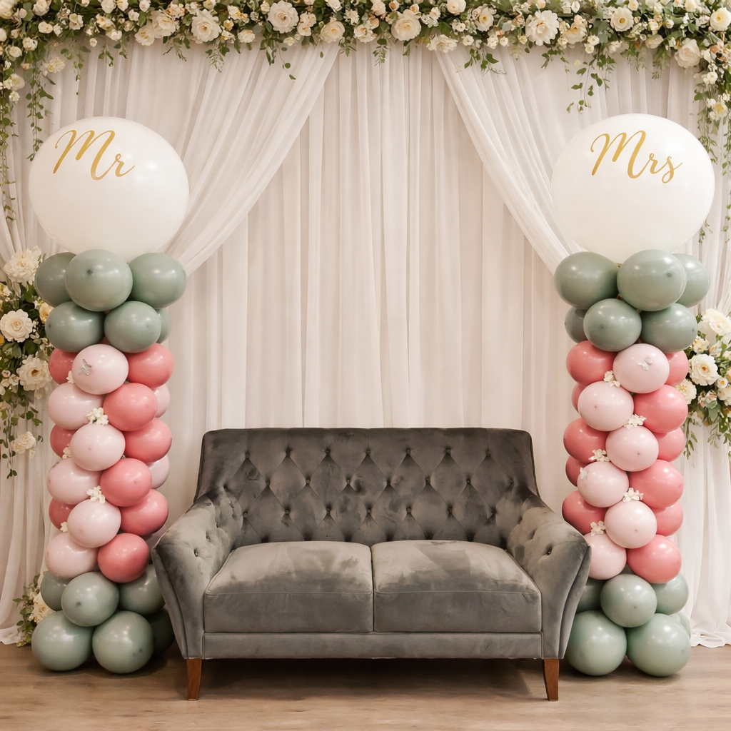 Ballonsäulen Mr. und Mrs. in matt Rosa, Rosegold und Eukalyptus