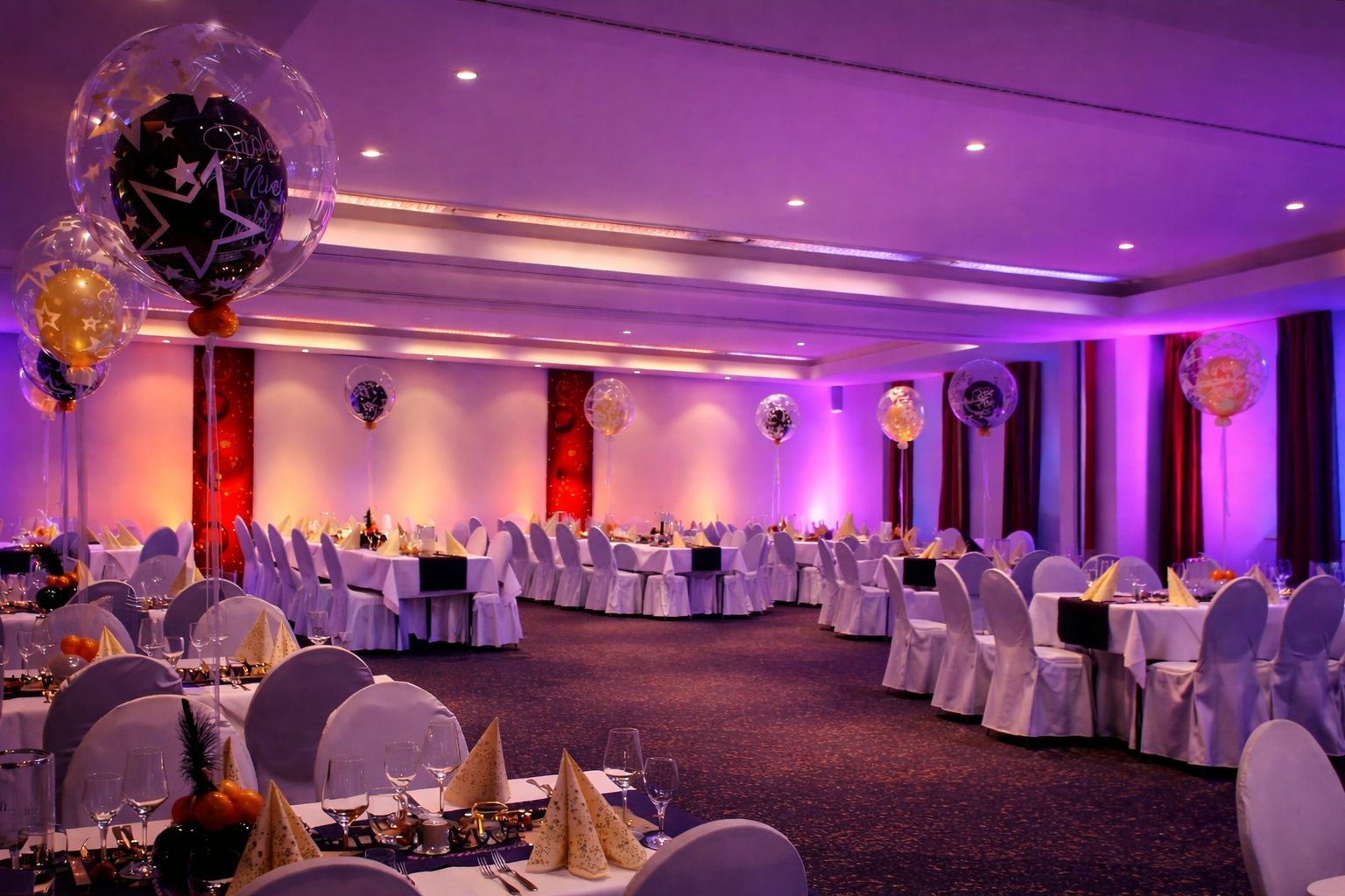 Silvesterdekoration mit verschiedenen Ballons in Gold und Schwarz